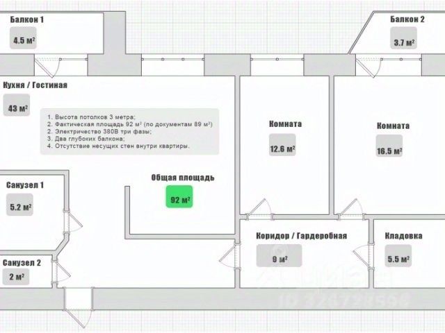 Особенности квартиры включают высоту потолков 3 метра. Фактическая площадь жилого помещения составляет 92 квадратных метра, хотя в технической документации указана площадь 89 квадратных метров. Электроснабжение осуществляется трехфазной сетью с напряжением 380 Вольт. Один взрослый собственник. Звоните и мы с удовольствием покажем и поможем Вам купить эту квартиру.
