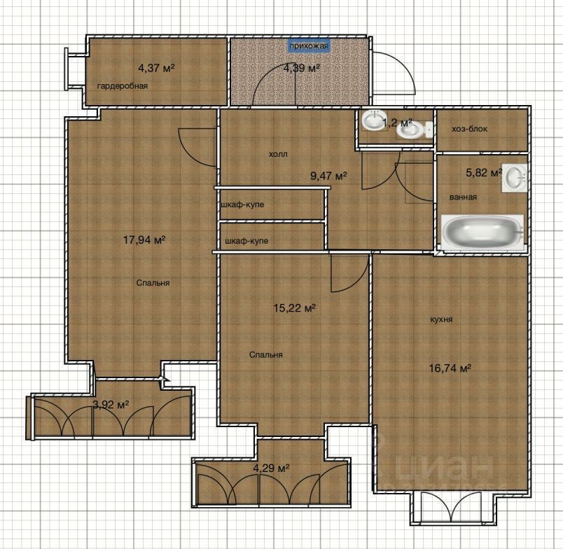 Продуманная планировка-встроенные шкафы-купе, гардеробная и хозяйственный блок.