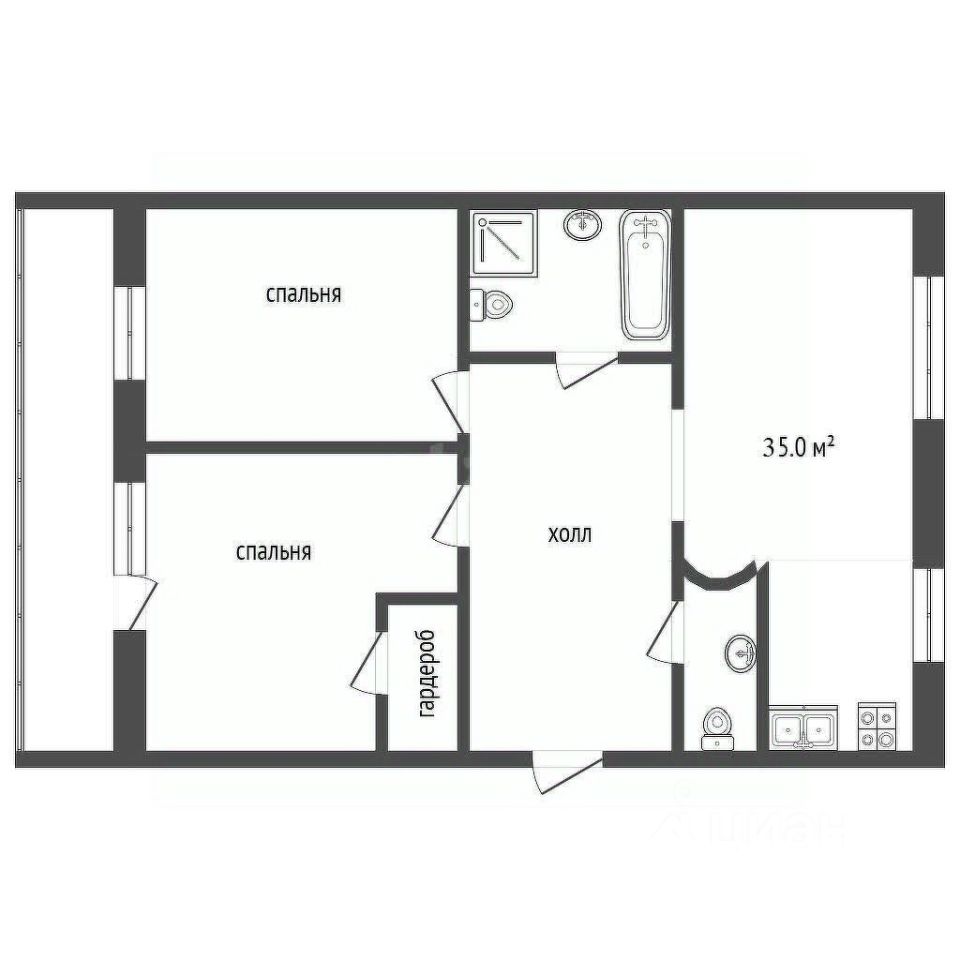 Две изолированных комнаты, огромная кухня-гостиная, большая прихожая. Большая ванная комната+туалет. Встроенная кладовка и гардеробная.