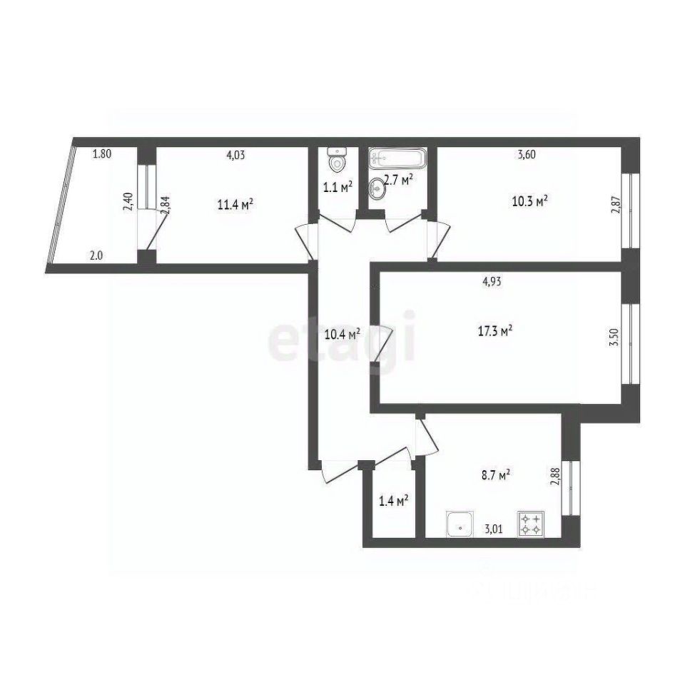Большая комната 17 м², спальни - 10 и 11 м², кухня - 8,7 м²,