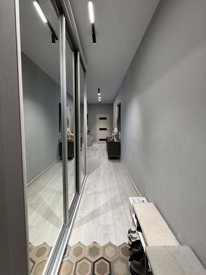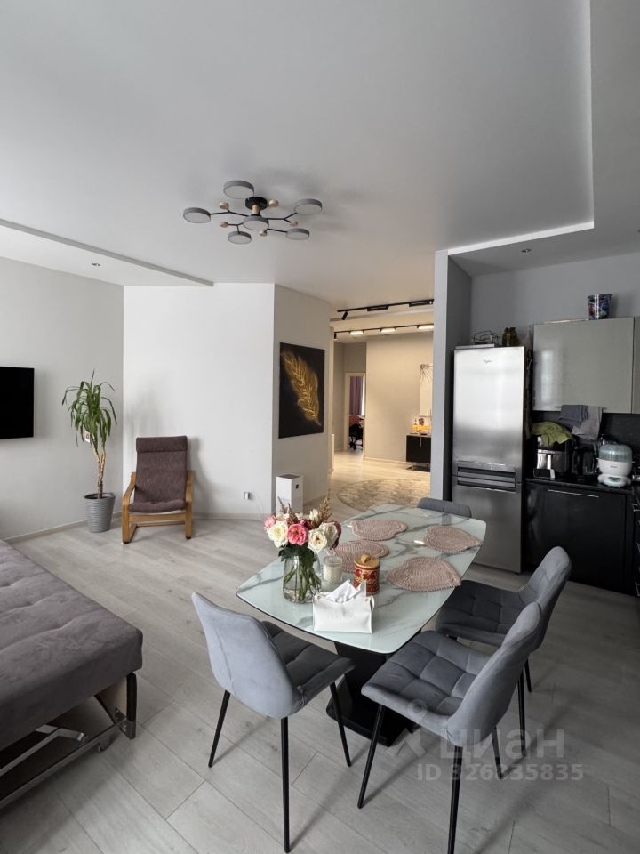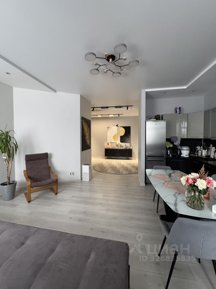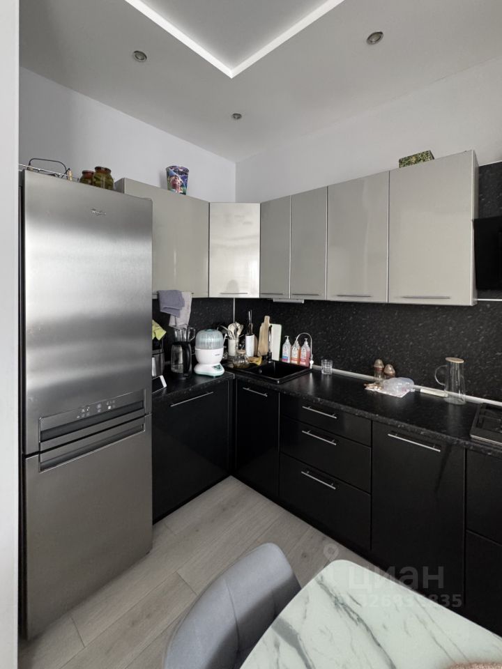 В квартире остаётся встроенный кухонный гарнитур с бытовой техникой, шкафы-купе, диван в гостиной.