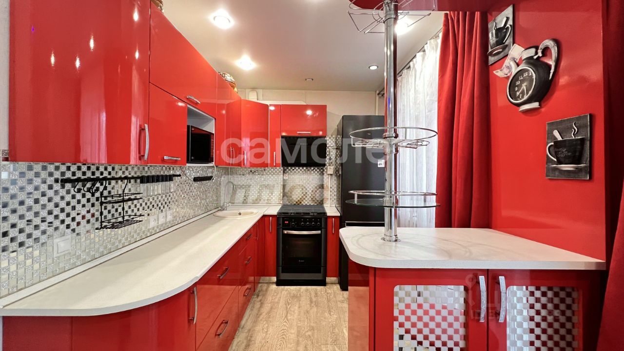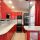 Стильный кухонный гарнитур алого цвета с барной стойкой и зеркальной мозаикой на фартуке.