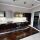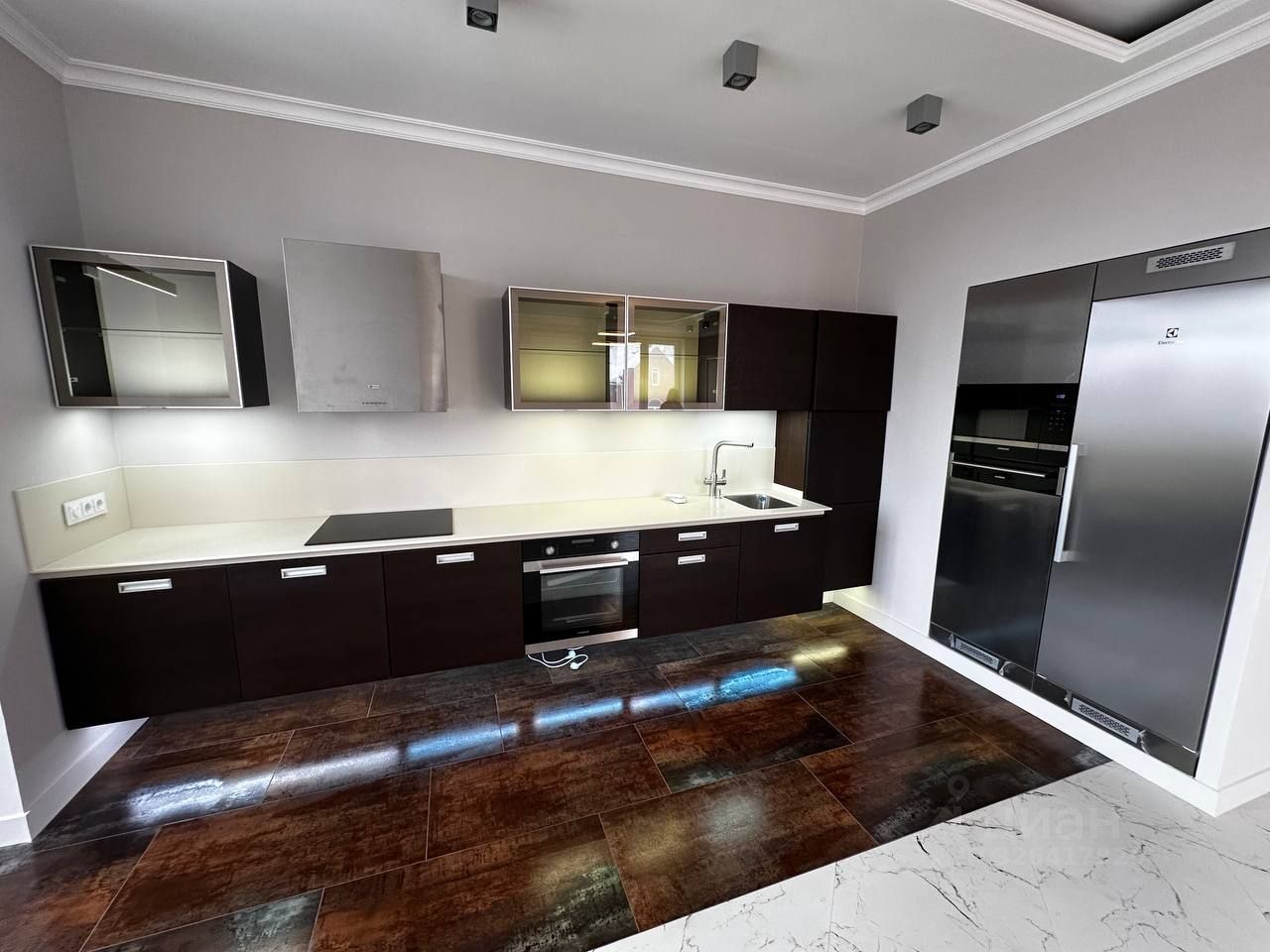 Просторная кухня-студия (61,4 м2): Итальянский кухонный гарнитур с фасадами венге, каменная столешница Samsung, встроенная техника Siemens класса люкс (индукционная варочная поверхность, духовой шкаф с пиролизом, СВЧ-печь, посудомоечная машина, пенал для подогрева посуды). Холодильная и морозильная камеры Electrolux, вытяжка Faber. Барная стойка и гостиный гарнитур с подсветкой.