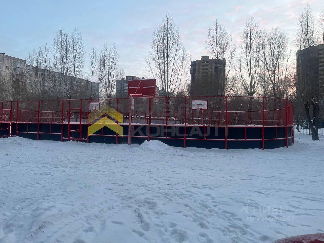 Во дворе новая спортивная коробка: зимой можно кататься на коньках и играть в хоккей, а летом - в футбол.
